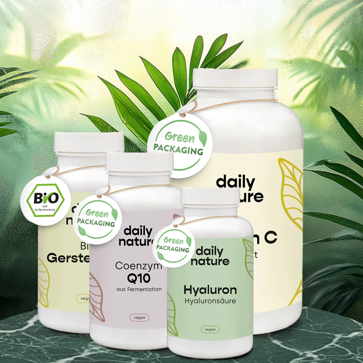 Alle Produkte von dailynature basieren auf natürlichen Inhaltsstoffen und sind frei von Gluten, Laktose, Konservierungsstoffen, Farbstoffen, GMOs, Zucker, Süßstoffen, Aromen, Farbstoffen, Gelatine, Magnesiumstearat und sonstigen unerwünschten Stoffen.